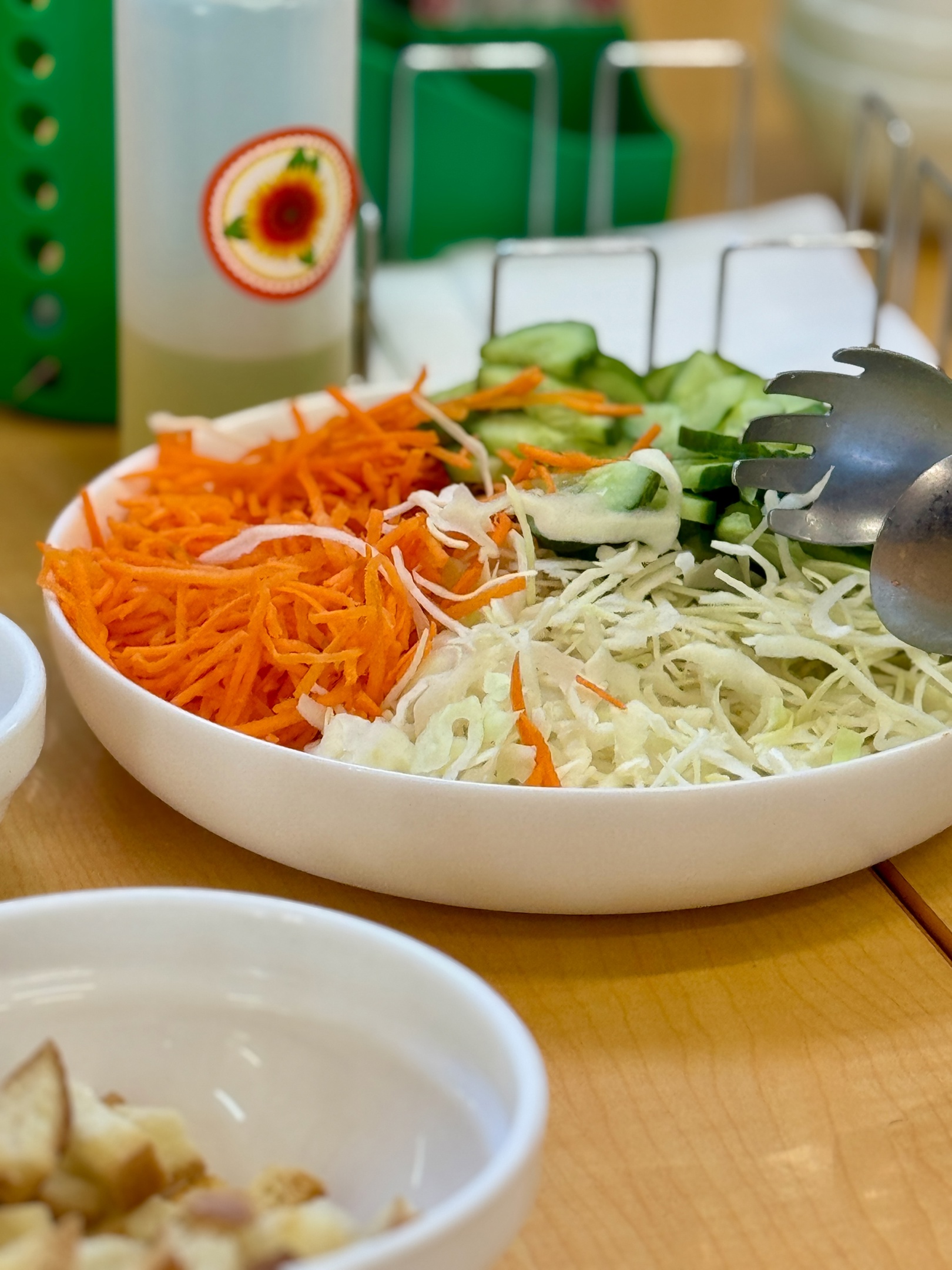 Салат-бар предлагал свежие огурцы, морковь и капусту, масло можно было добавить самостоятельно.
