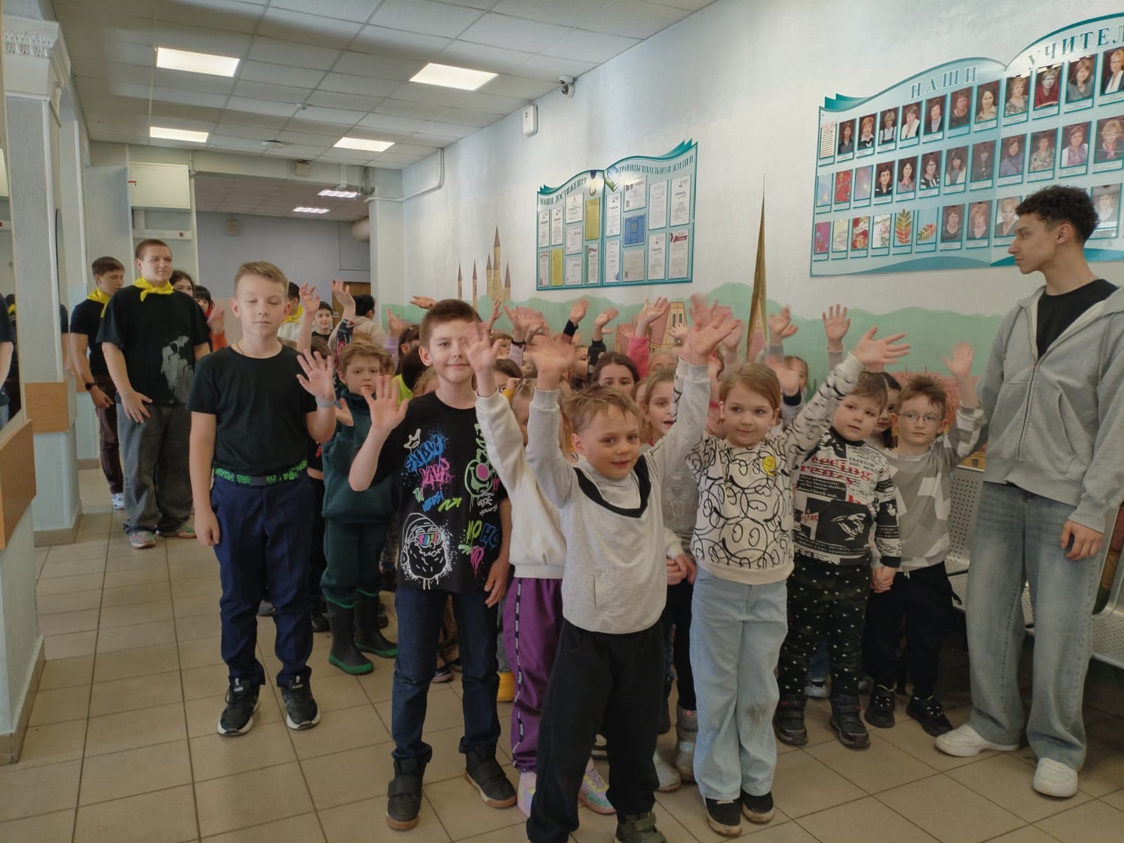 Детей радушно встретили юнармейцы-волонтёры, ставшие их проводниками. Первой остановкой стал актовый зал, где малыши с интересом посмотрели отрывок из сказки «Кот в сапогах» в исполнении учеников 4«А» класса.