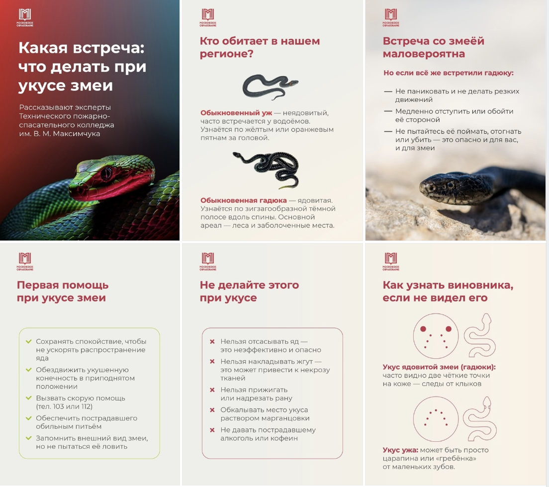 Департамент образования и науки города Москвы выпустил полезные карточки с рекомендациями: как вести себя при встрече со змеёй, чтобы избежать опасности.