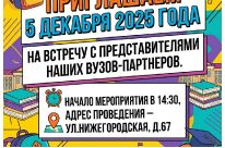 Приглашаем вас 5 декабря 2025 года на встречу с представителями наших вузов-партнеров. Начало мероприятия в 14:30, адрес проведения – ул.Нижегородская, д.67.